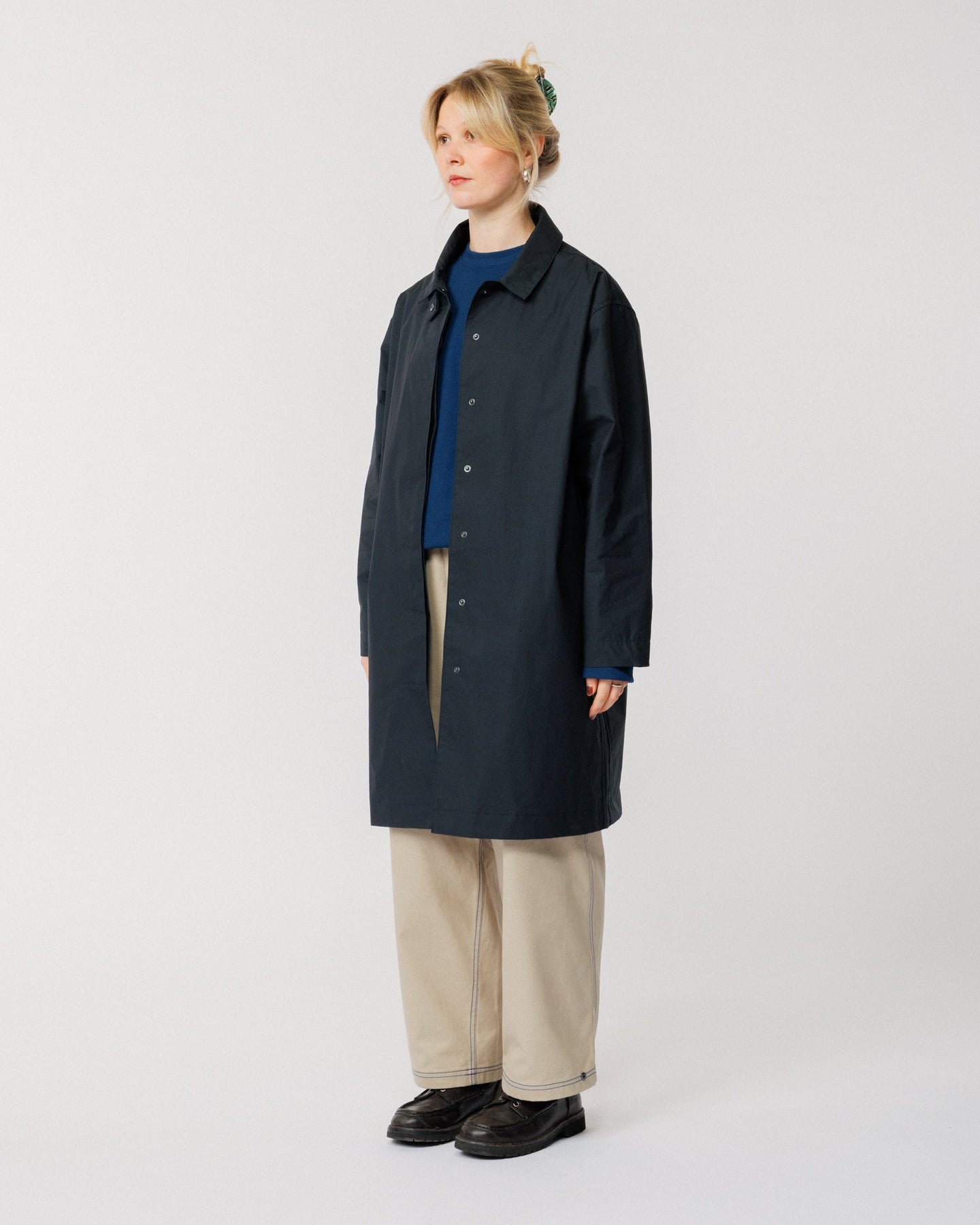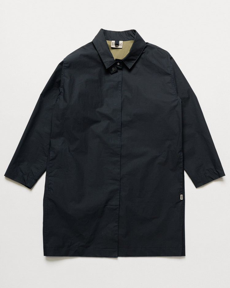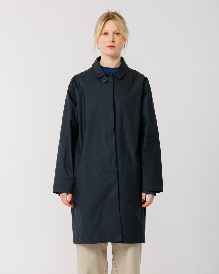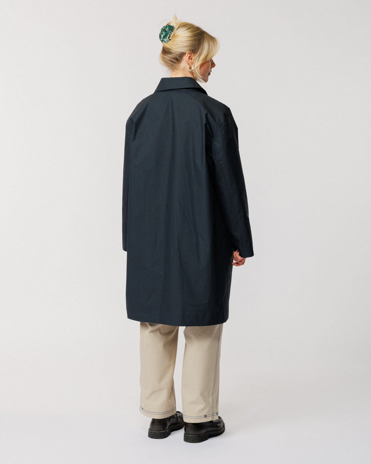 Crafted from organic Bio Nova waxed cotton by Halley Stevensons - specialists in weatherproof textiles since 1864 - this premium fabric features a bio-based, fluorocarbon-free (FCF) coating. The result is a breathable, lightweight mac with a subtle technical feel that keeps you dry in a shower without the bulk of a traditional waxed jacket.
