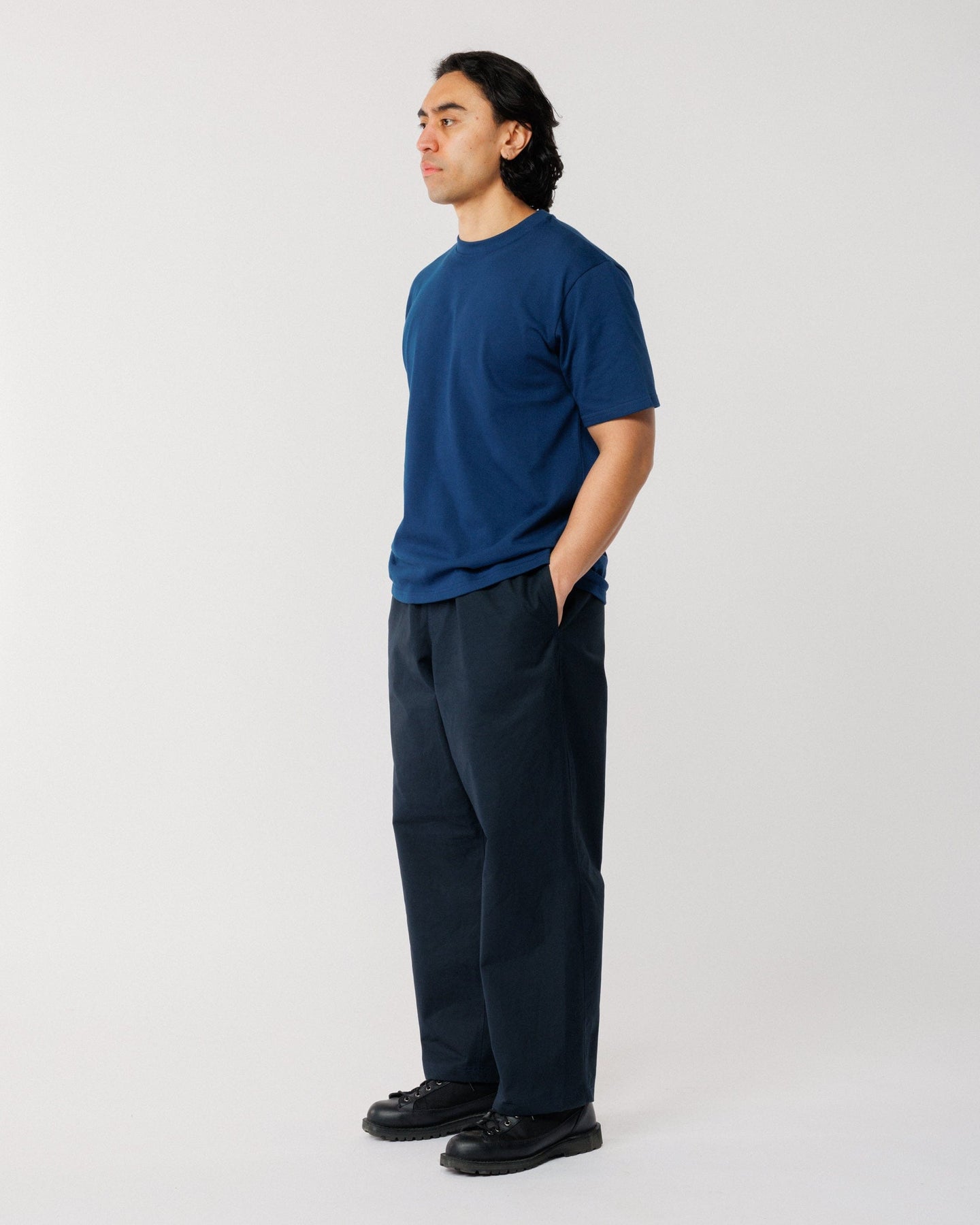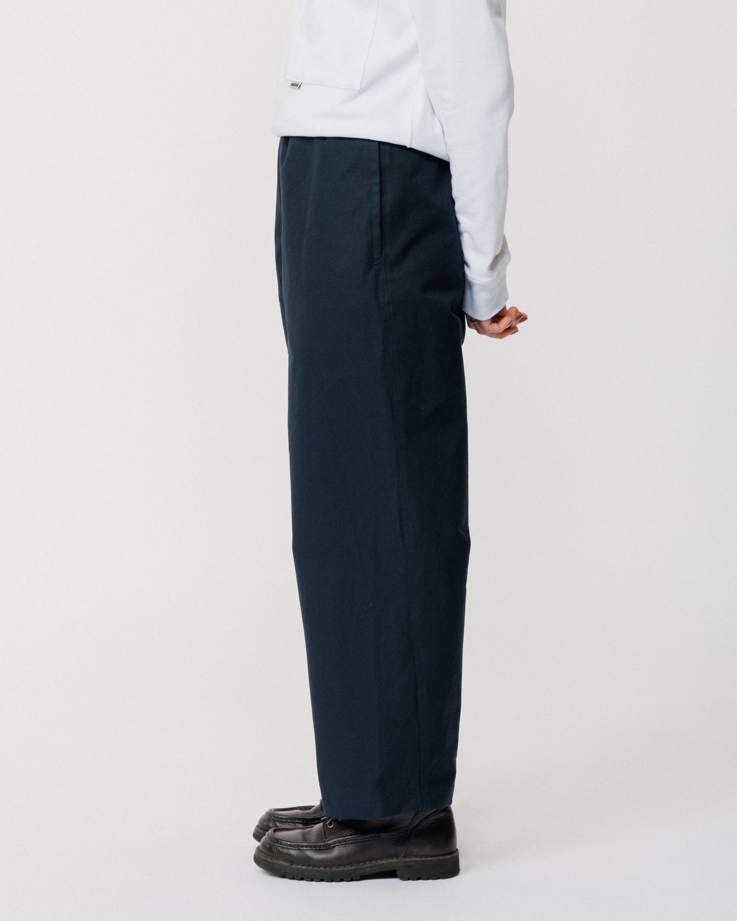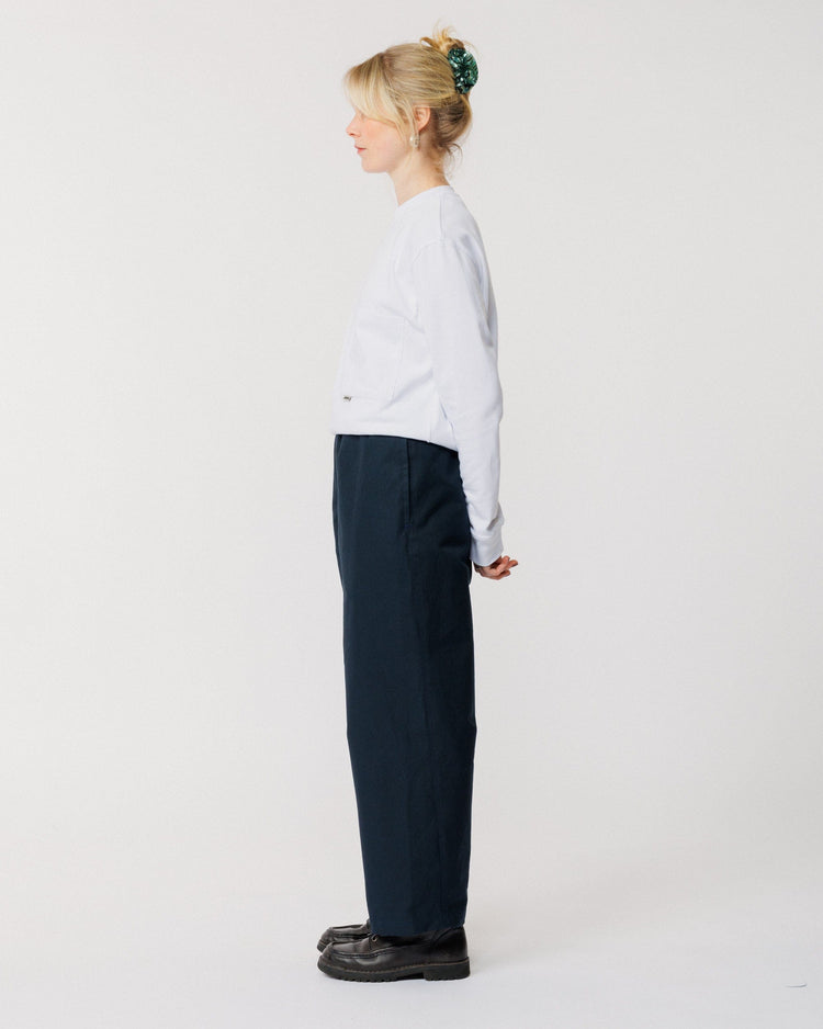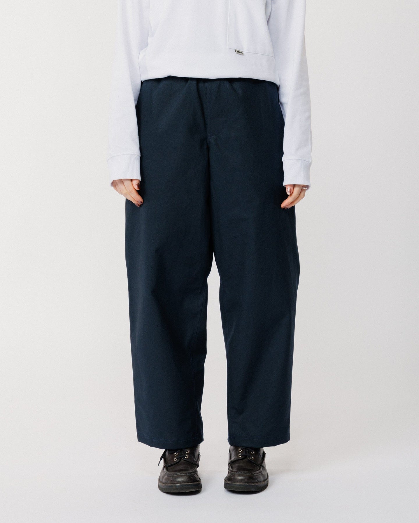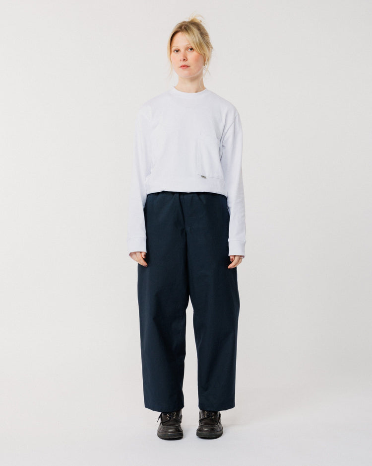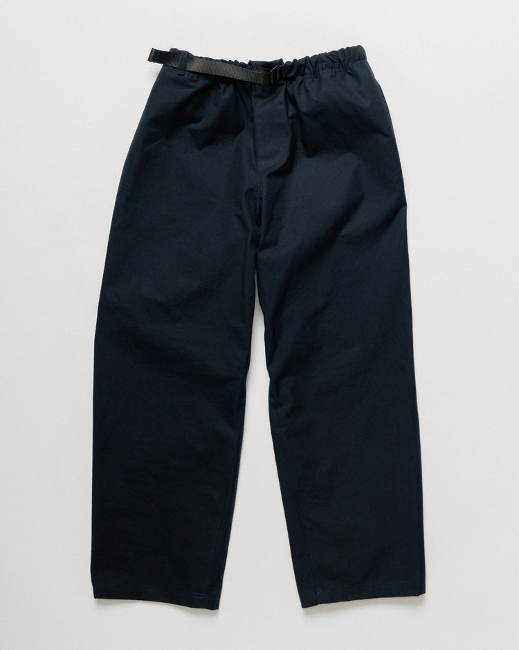 Crafted from cotton twill with a technical water-resistant finish, these pants are soft, structured, and effortlessly wearable. The wide leg silhouette and elasticated waistband create a relaxed, modern shape, while reinforced gussets ensure durability and enhanced ease of movement.