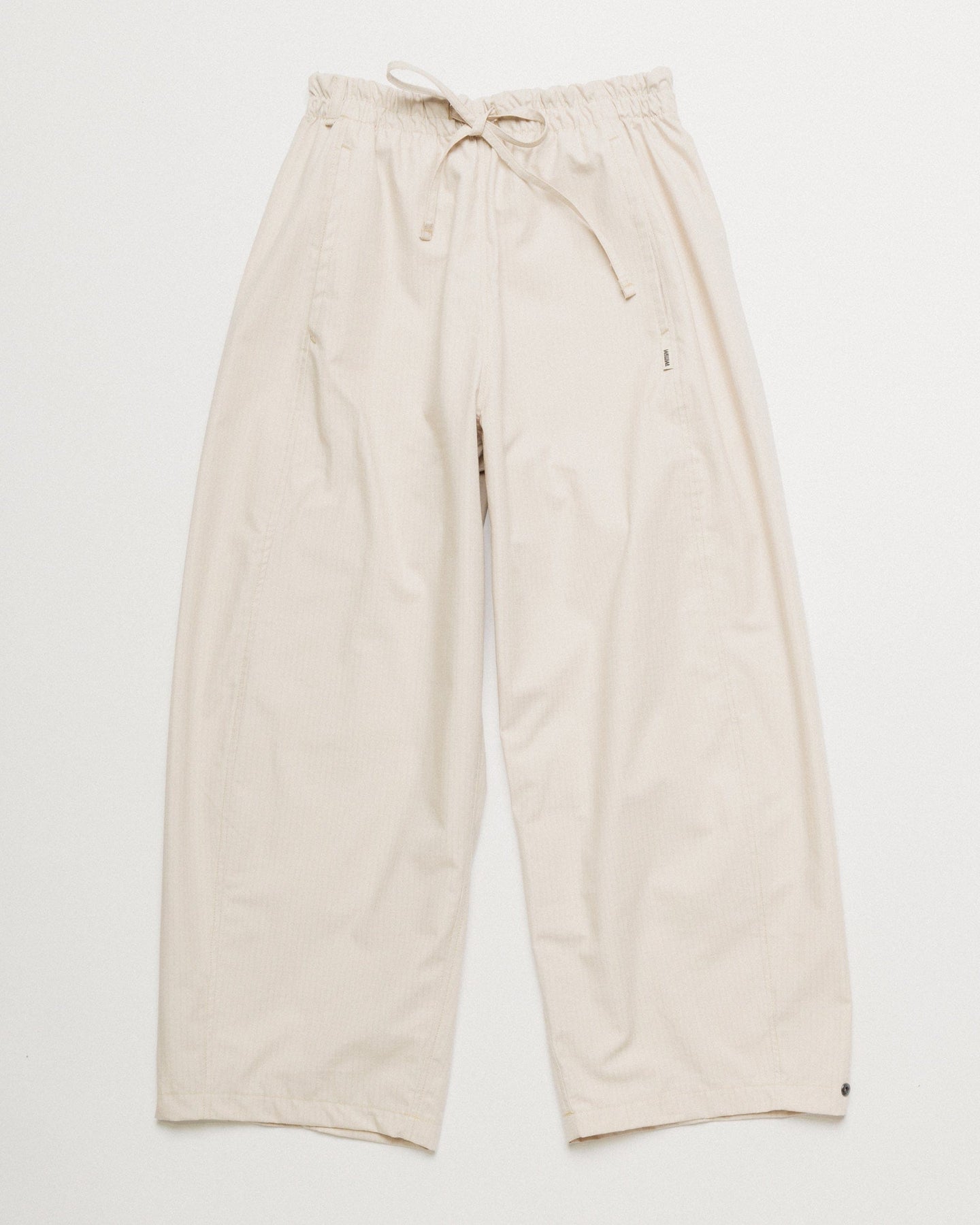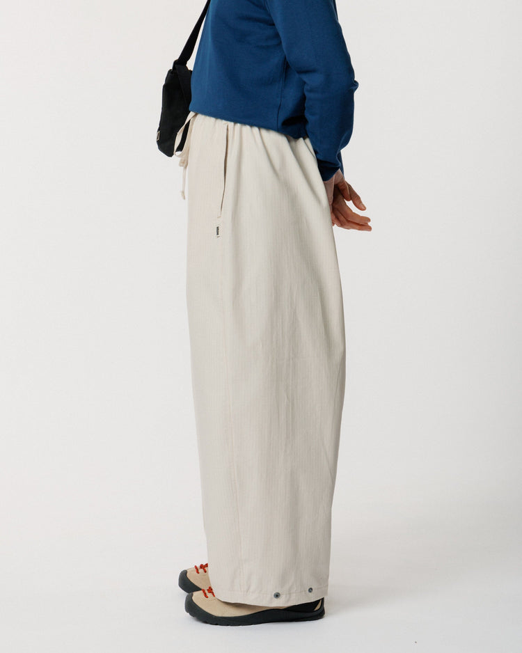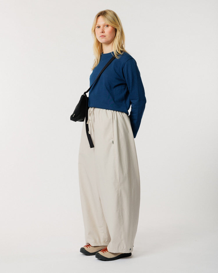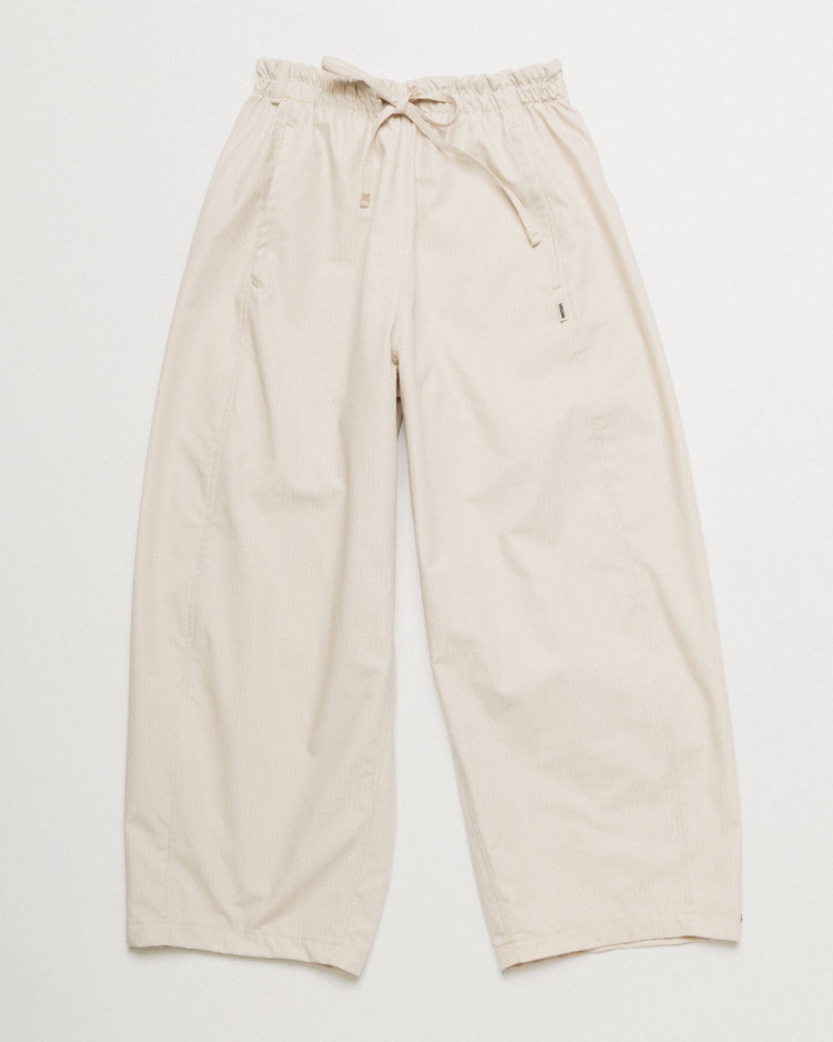 The silhouette is defined by off-centre seam detailing that gently sculpts the voluminous barrel leg while maintaining a clean, contemporary profile. An elasticated waistband with drawstrings delivers all-day comfort and an adjustable fit, sitting naturally on the body without restriction. Deep side pockets are cut to hold essentials, while an integrated key loop adds everyday practicality.