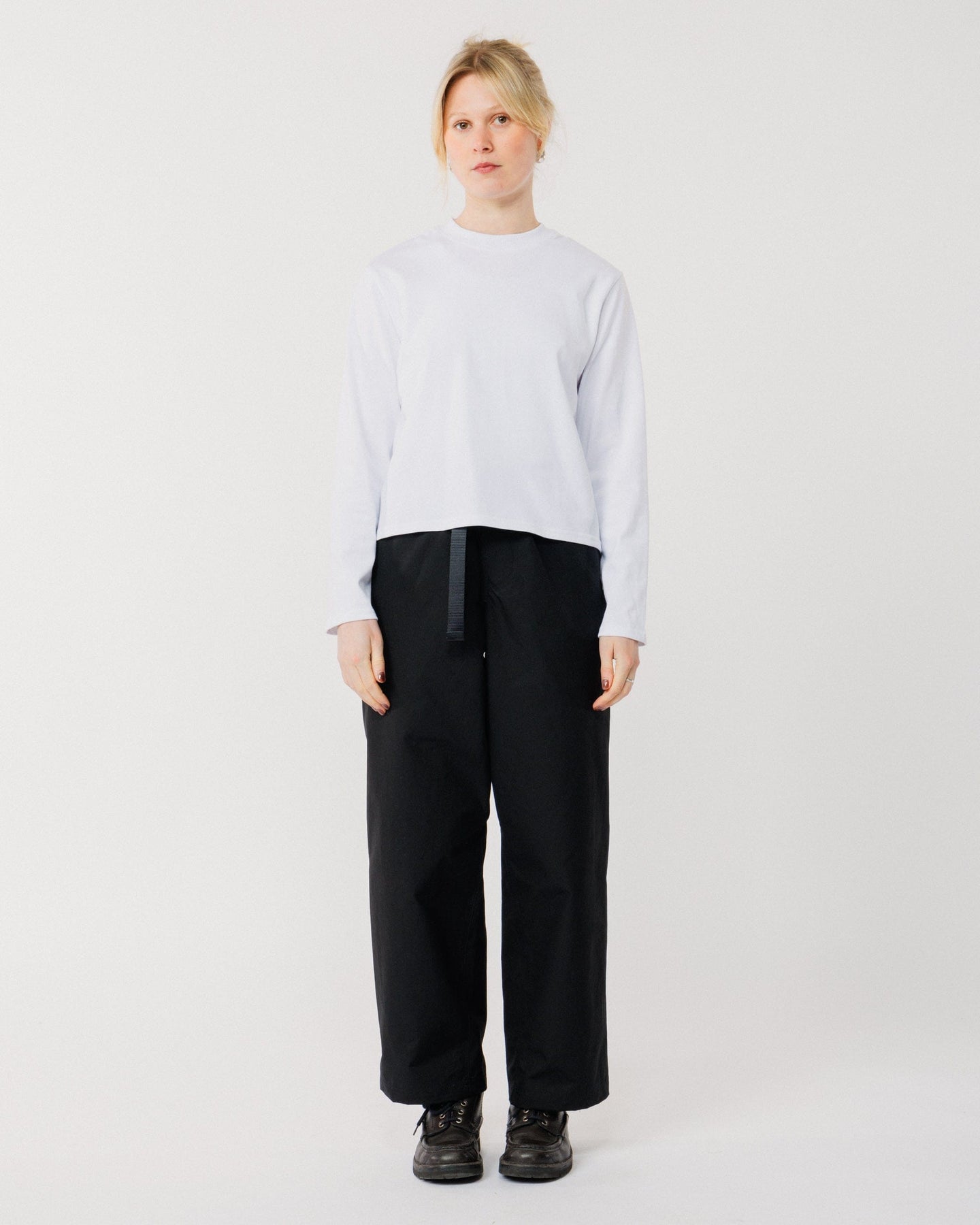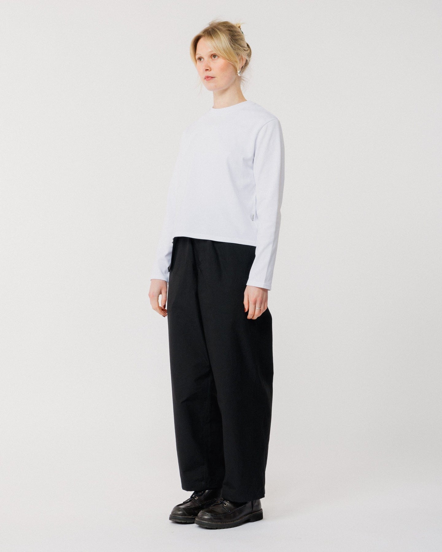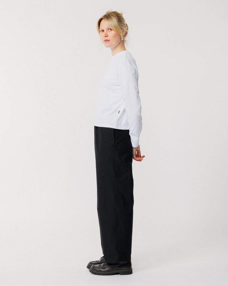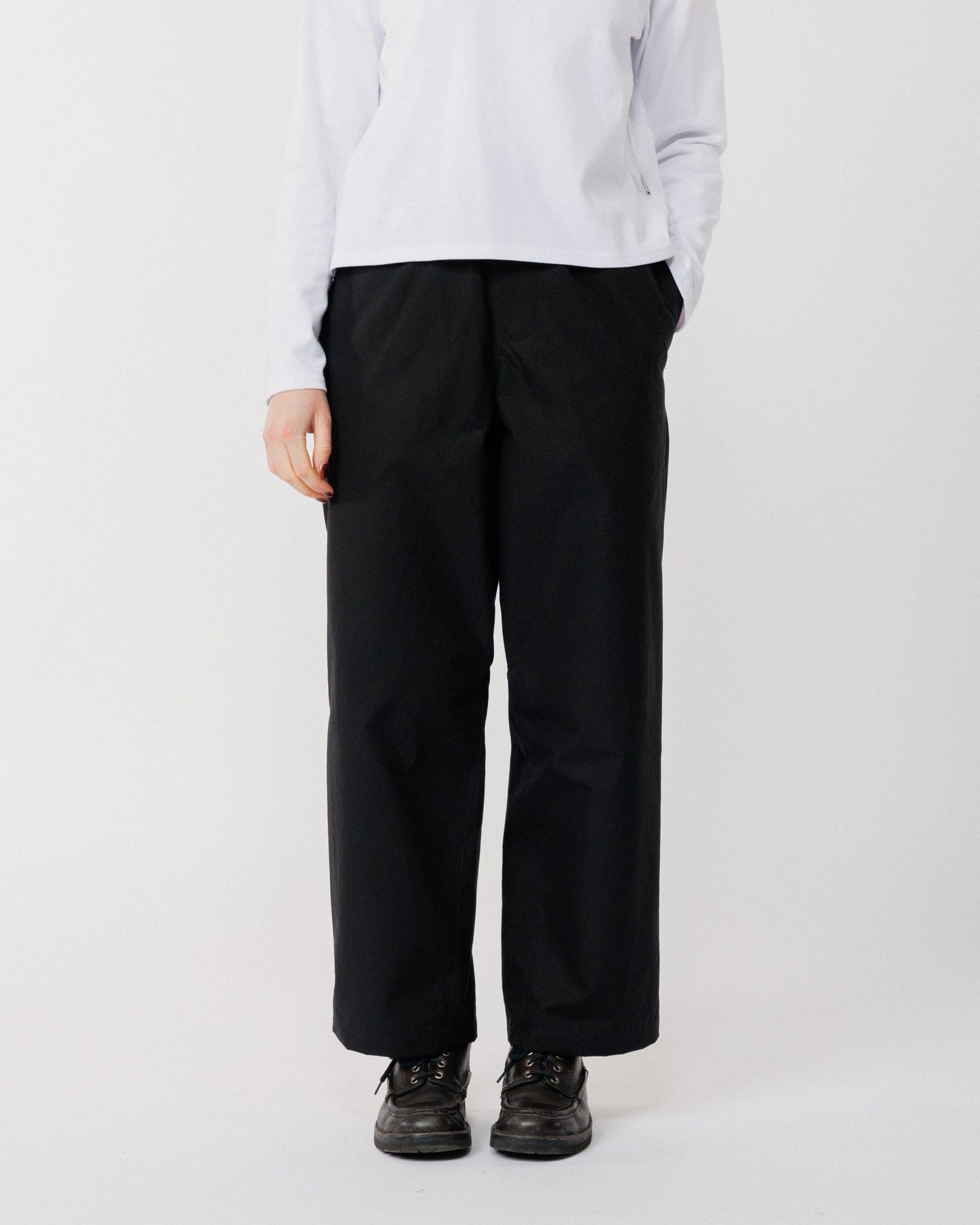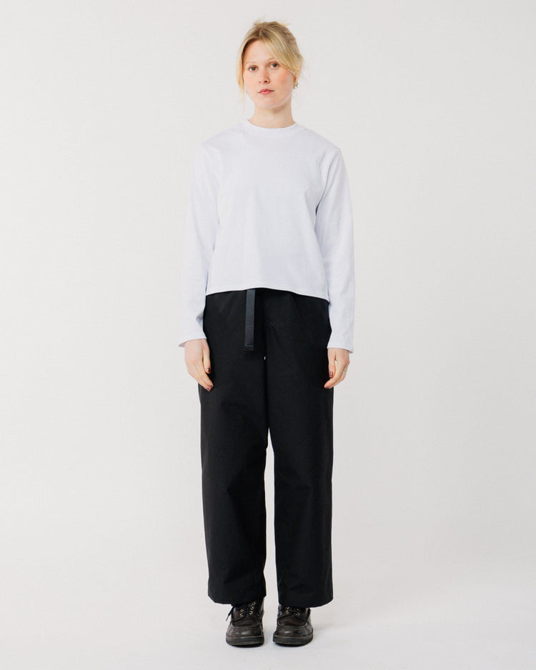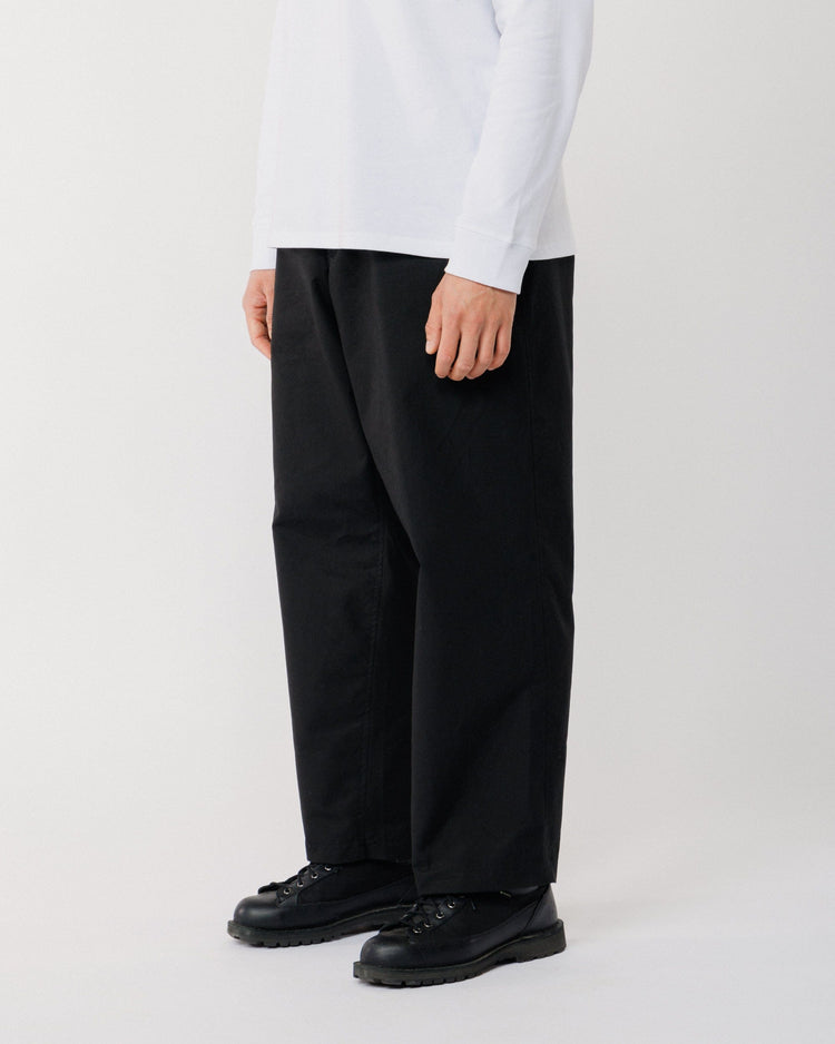 Crafted from cotton twill with a technical water-resistant finish, these pants are soft, structured, and effortlessly wearable. The wide leg silhouette and elasticated waistband create a relaxed, modern shape, while reinforced gussets ensure durability and enhanced ease of movement.
