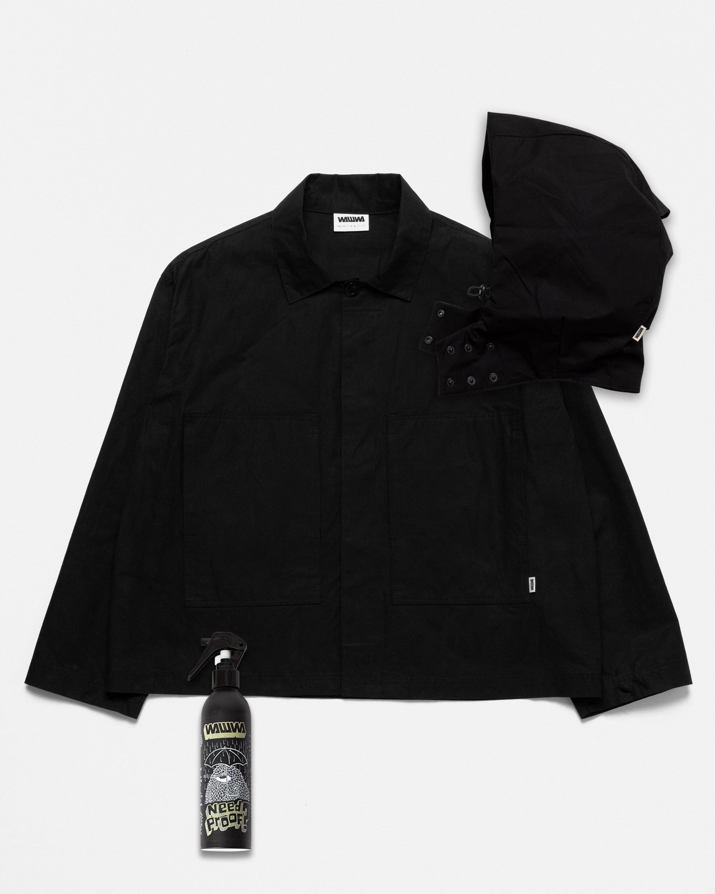 The Nell Overshirt & Hood Set in classic black is the ultimate WAWWA outerwear package - bringing together the versatile Nell Overshirt, its modular detachable hood, and Reproofing Spray to keep your gear performing at its best.