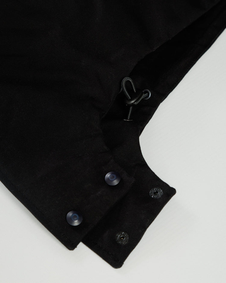 The detachable hood, made from the same dry-waxed cotton, attaches seamlessly via hidden poppers. Its tyre panel design, double-layered construction, and multiple adjustment points provide superior protection and a custom fit when you need extra coverage.
