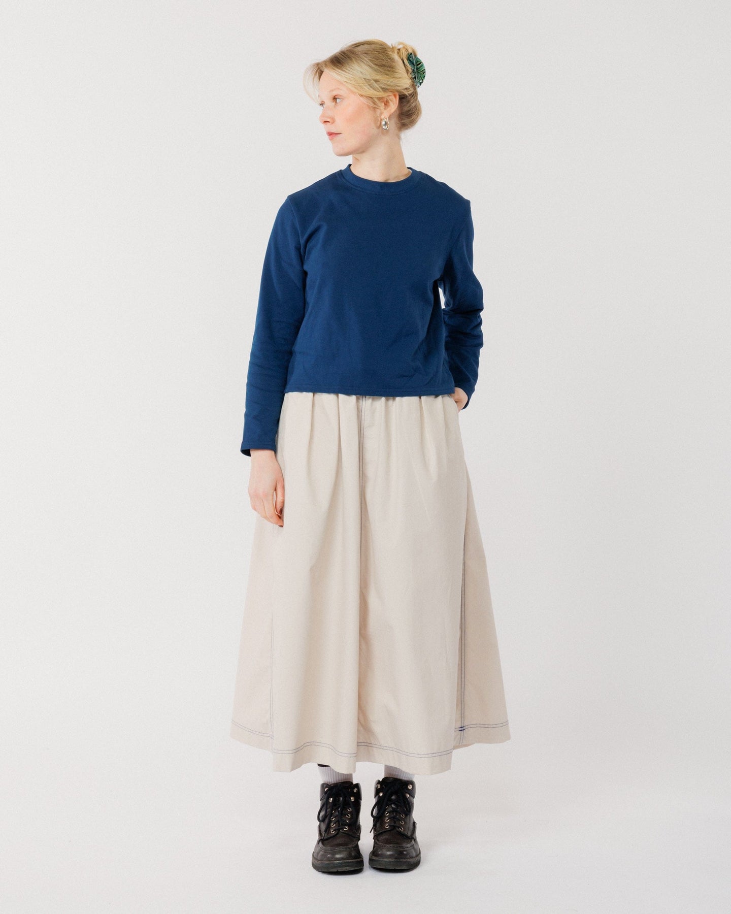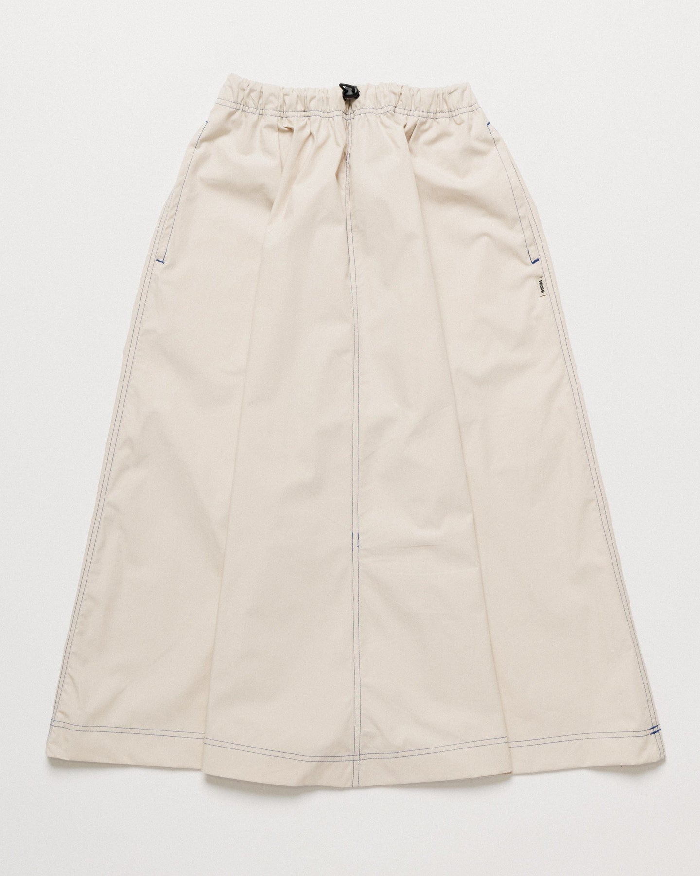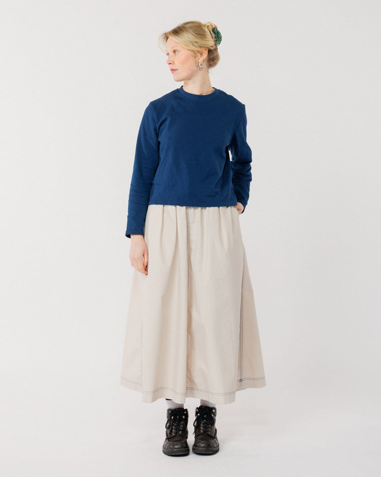 The flattering A-line silhouette sits comfortably on the waist thanks to an elasticated waistband, while deep side pockets add a functional, considered touch. The cobalt blue stitching injects a pop of colour, accentuating the skirt’s clean lines and precision craftsmanship.