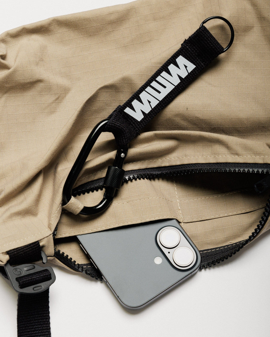A recycled zip fastening secures the main compartment, opening to reveal internal pockets and a built-in key loop to keep smaller items in place and easy to reach. An adjustable cotton webbing strap with metal G-hooks offers comfort and adaptability on the move.